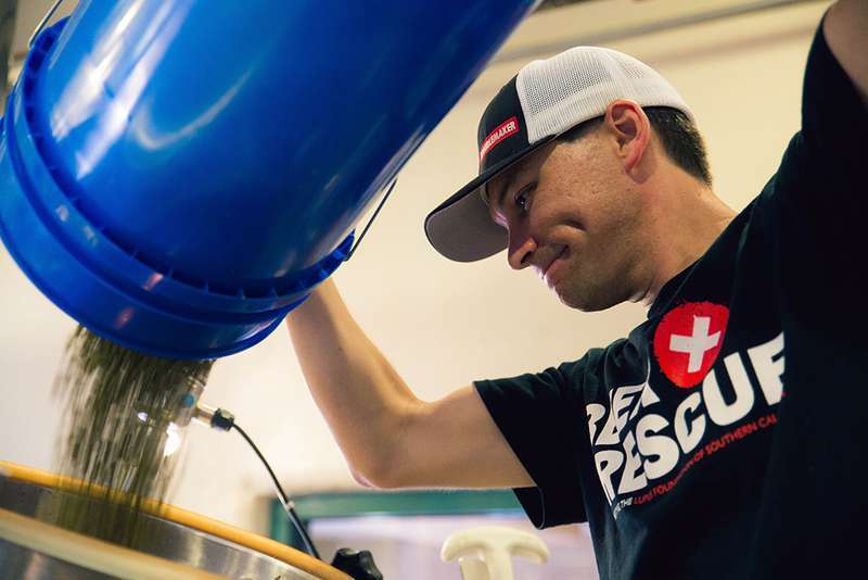 From the Brewer: “Who doesn’t like Skittles? It’s my favorite candy—except I hate the green apple flavor they switched to from the lime, because it ruins everything and totally interrupted the balance of the Skittles. So, for this beer, we went back to the original lime. I decided to use a Belgian tripel as the base, because it’s a better way to accentuate the fruity flavors. We sourced the fruit from all over the place. There were Concord grapes from Washington State; strawberries were from Oregon; and oranges, lemons and limes from Southern California. The point was for people to be able to experience all five of these flavors together and taste the rainbow just like if they popped a handful of Skittles into their mouths. I’m surprised with just how close the flavor of the finished beer is to the candy itself. And that carries through to the aroma, which matched the scent when we tore open an actual bag of that candy. Yet, it’s still very refreshing. The best part, by far, was watching Brandon sweat it out and do lots of manual labor…for a change!”—Kris Ketcham, Liberty Station Brewing Manager, Stone Brewing Co.