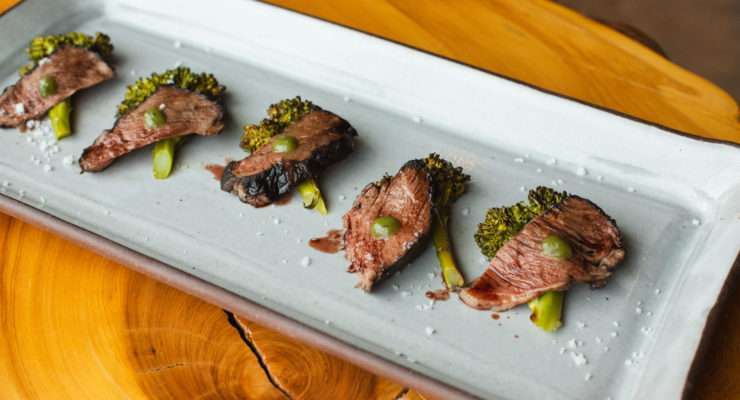 “I wanted a strong protein for the small plate menu that was shareable and not drowned in a gravy as I so often see, so for this dish we char the short rib in a hibiscus glaze and finish the broccolini in a lemonade broth. They’re then stacked in individual ‘bites’ and plated with a dab of chermoula and a sprinkle of salt to balance the sweet glaze and broth. Pair with Rojoe Red Ale.”