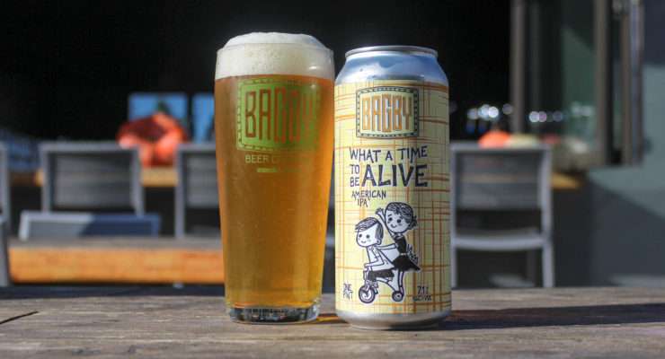 From the Brewer: “For our fifth anniversary, we wanted to brew an IPA that showcased what we are and how we brew IPAs. In what seems to be a sea of hazy, fruited, lactose-filled, weakly bittered ‘IPA’, we wanted to show what we feel IPA really is and should always be. Because we do not have a canning line and transporting beer would be extremely risky and difficult, we decided to ask our good friends at Port Brewing if they would let us brew something and can it at their facility. After all, what better like-minded IPA brewery and people could we choose? The beer is brewed with five hops: Centennial, Simcoe, Amarillo, Cascade and Chinook. All hops that we love and use regularly; one for each great year of Bagby Beer. Our brewer Brandon Barclay and I went over to Port Brewing to brew the beer, dry-hop and package it. The label was completely designed and created by [my wife and brewpub co-owner] Dande. The two ‘kids’ on the tricycle…well, you can guess who they might be. This beer is bright, bitter, aromatic and absolutely delicious. For those who have lost their way with IPA, What a Time to Be Alive will bring you back!”—Jeff Bagby, Co-owner & Head Brewer, Bagby Beer Co.